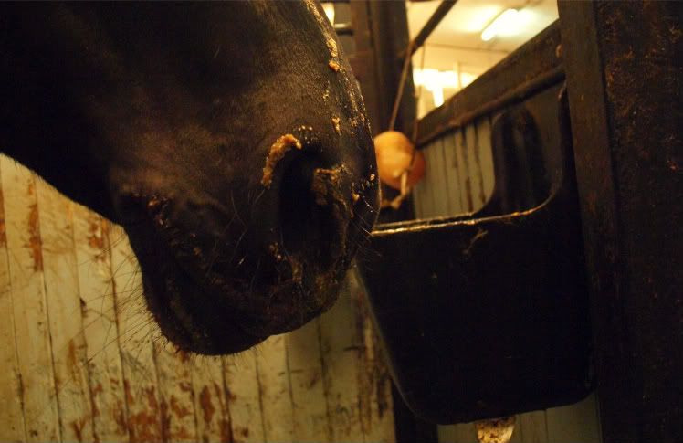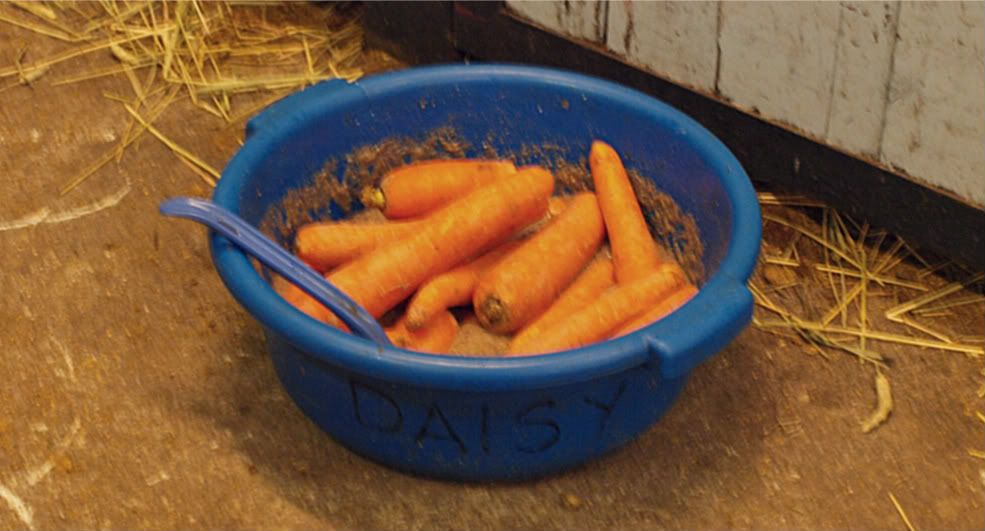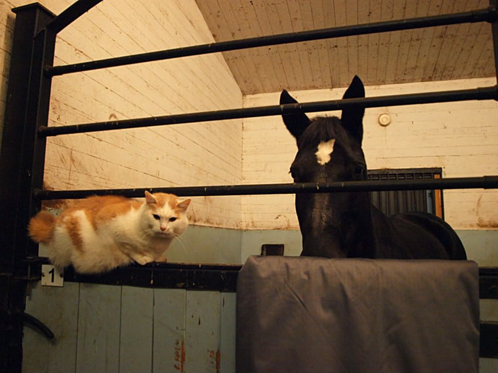 Daisyllä oli aamupäivällä raspaus ja kävin illalla taluttelemassa puolisen tuntia, jottei koko päivä menisi ihan seisomiseksi. Daisy nautti ja oli kiltisti. Annoin iltapuurot porkkanoineen. Loppukevennykseksi Pertti hyppäsi karsinan oven päälle ja poseerasi kameralle.