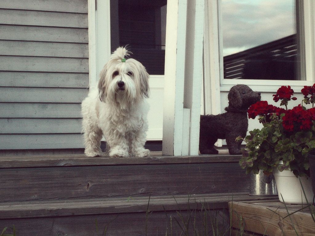Amie sai kesälookin. Tosi kiltisti antoi kammata ja leikellä turkkia. Kuivattelu sujui parhaiten olkkarin matolla riehuessa. Ei ehkä yhtä siisti lopputulos kuin trimmaajalla, mutta säästyypähän rahaa ja koira saa nauttia kesästä läkähtymättä paksun turkin alle. Tulipahan samalla imuroitua ja pestyä pyykkiä kun kaikki oli valkoisessa karvassa..