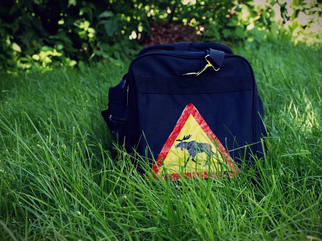 Askartelinpaskartelin taas vaihteeksi jotain. Muovipussin kyljessä oli hassu hirvi-liikennemerkki. Leikkasin irti ja ompelin kiinni kolmen euron urheilukassiin. Perhoinen sai varmaan hyvät naurut, kun kuvailin aikaansaannostani puskassa. 8)