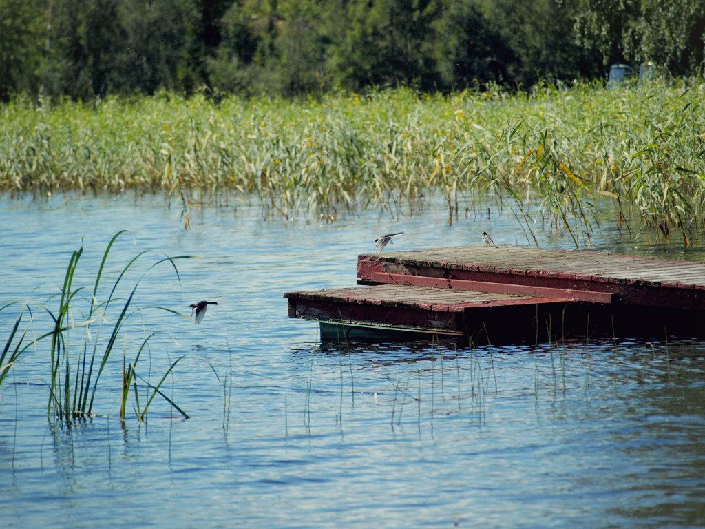Hiekkapohjainen järven ranta, kaislikkoa, vanha, vettä upoksiin täynnä oleva vene, sisiliskon poikasia kiirehtimässä takaisin halkopinon suojiin, pullasorsia.. ja maiseman kruunaa vanha laituri, josta punainen väri on jo alkanut kulua pois, mutta on se silti niin hieno. Amie kävi polskimassa rantamatalikossa. Itse istuksin laiturilla ja söin jätskiä.