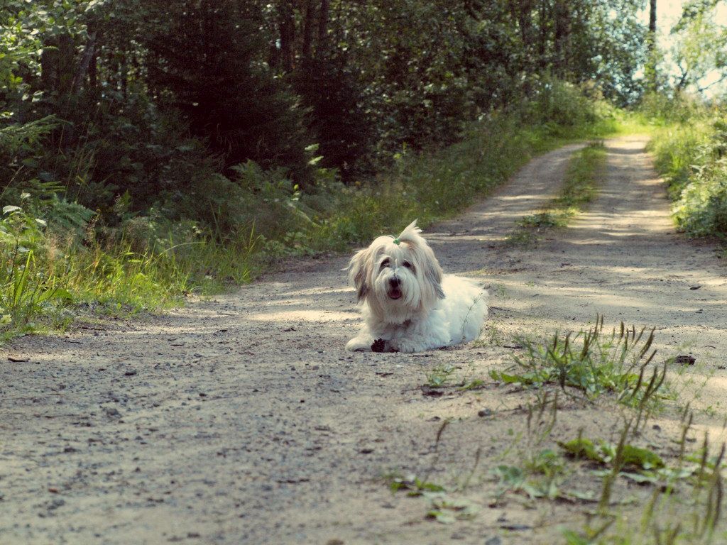 Käyskentelin pitkin mökkitietä. Amie seurasi perästä kiemurrellen tien puolelta toiselle hajujen perässä. Pysähdyin keräämään kesän viimeisiä metsämansikoita, jotka popsinkin sitten saman tien. Lokit nauroivat jossain kauempana järven vastarannalla.
